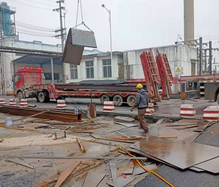 雨后大貨車?yán)瓉砹诵碌氖┕げ牧?,員工正在卸貨,牢記安全第一,地上慢慢減少的材料是工人“戰(zhàn)績(jī)”的證明。