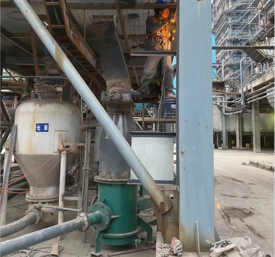 料封泵一般安裝在料倉底部,新投產(chǎn)的料封泵應(yīng)先把活動風(fēng)管外腔加入足量的潤滑油,再通過執(zhí)行機(jī)構(gòu)對活動風(fēng)管進(jìn)行調(diào)整,來改變噴嘴與噴頭之間的距離,通過調(diào)試來選擇一個(gè)比較理想的位置同時(shí)記下標(biāo)尺刻度,開始正常工作。停機(jī)時(shí)先使噴嘴與噴頭閉合并使管道內(nèi)物料全部輸送完才能停風(fēng)。料封泵只有在料面具有一定高度時(shí)才能正常工作,如果料位低于一定值時(shí)輸送量就會減少,如果突然停氣等原因使管道堵塞時(shí),應(yīng)使噴嘴與噴頭閉合吹起直至管道暢通。